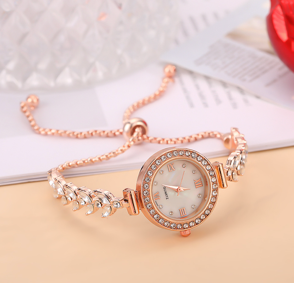Elegant Design: A crystal-encrusted bezel and leaf-style chain offer a refined and eye-catching appearance.